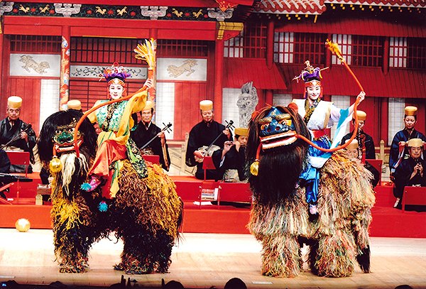 中国楽曲にのせて、二頭の獅子が二人の舞い手と戯れる様子では、