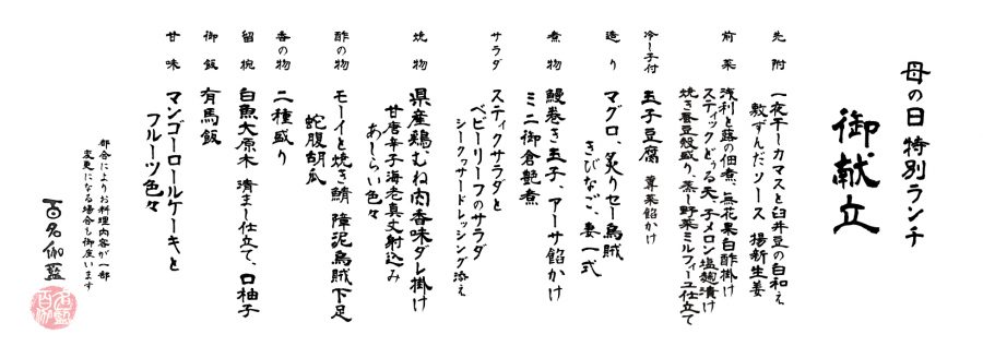 いつも笑顔で家族のために頑張って下さっているお母様へ、美味しいお食事とともに感謝を伝えてみませんか。
